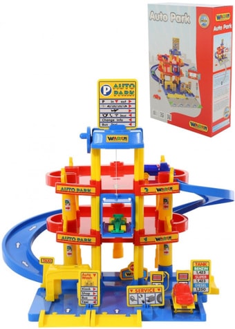 | Информация | Компактный трехуровневый паркинг с тремя мини-автомобилями. На первом уровне паркинга располагаются: автомойка, автозаправка, автосервис с эстакадой. На второй и третий уровни автомобили поднимаются на лифте с ручным приводом, то есть для движения лифта ребенку нужно поворачивать рукоятку на верхнем уровне |