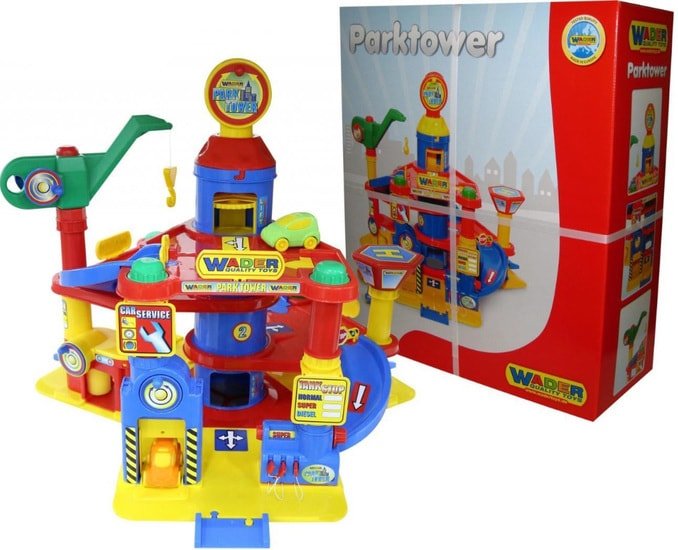 | Информация | Паркинг представляет собой четырехуровневую парковку. На парковку автомобили можно поднимать на лифте, а спускать по съездам. Машинки (2шт.), входящие в набор, можно обслужить в игрушечном автосервисе - проверить автомобиль на подъёмнике, "помыть" на автомойке, а заправить на АЗС, выбрав подходящее топливо. Лифт, мойка и эстакада приводятся в движение при вращении установленных рукояток, так же как и подъемный кран. |