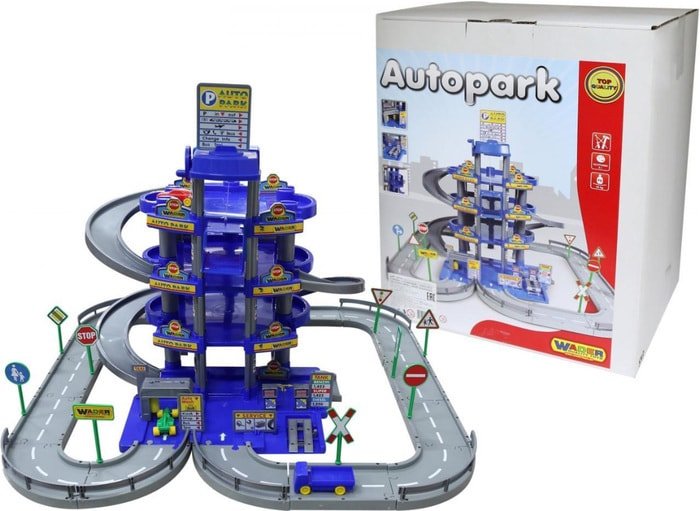 | Информация | Красивый четырехуровневый паркинг с тремя мини-автомобилями, дорогой и дорожными знаками (10 шт.). На первом уровне паркинга расположены автомойка, автозаправка, автосервис с эстакадой. На остальные уровни автомобили поднимаются на лифте с ручным приводом, то есть для движения лифта ребенку нужно поворачивать рукоятку на верхнем уровне |