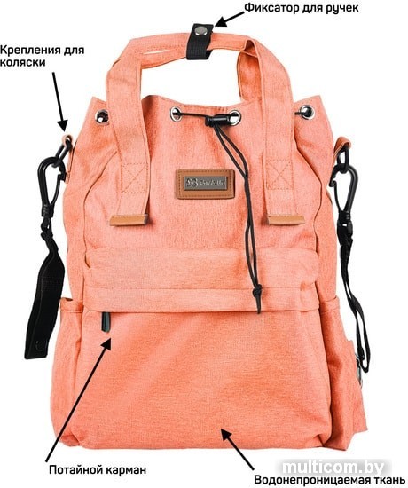 | Информация | Удобный и лёгкий рюкзак модели Farfello F7 станет незаменимым помощником для мобильных мам. Рюкзак выполнен из качественной водонепроницаемой ткани и оснащен множеством карманов и отделов: для бутылочек, соски, документов, телефона и шнурком для прикрепления ключей. Также имеется наружный боковой карман для быстрого извлечения влажных салфеток. У данной модели верхняя часть основного отдела затягивается шнурком через металлические люверсы и закрывается на кнопочку. Рюкзак удобен тем, что его можно носить и на плечах, в руках в виде сумочки или подвесить его на ручку коляски с помощью специальных ремешков на клепках, которые идут в комплекте. |