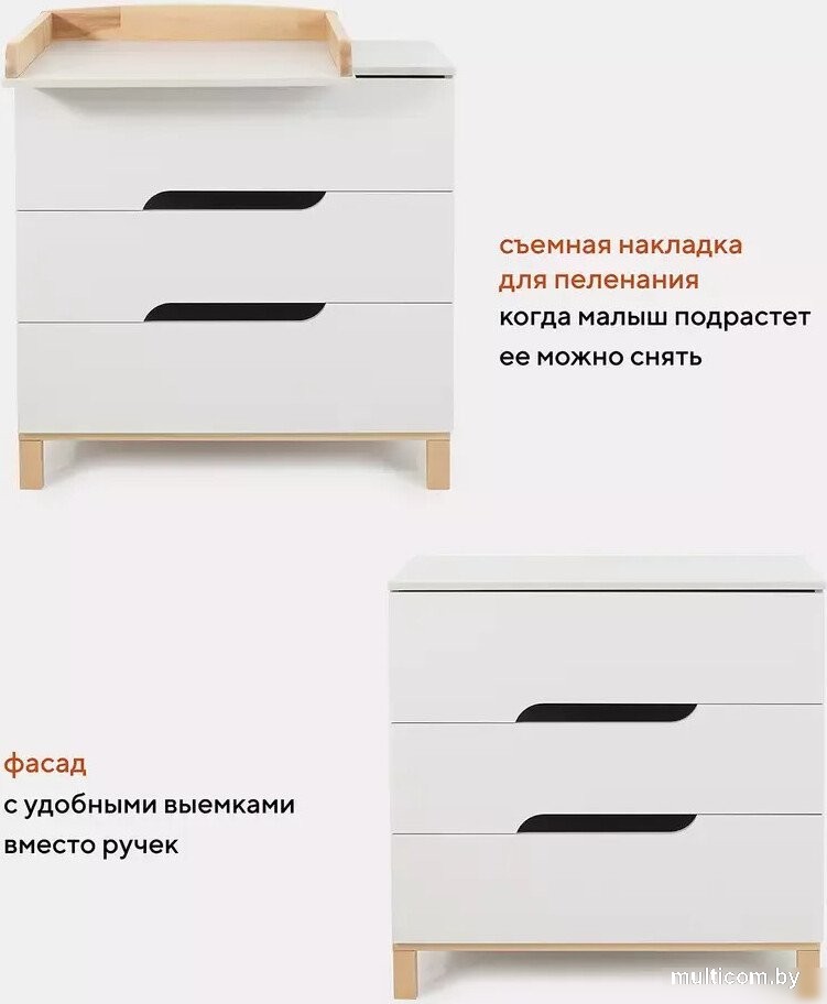 | Информация | Эффектный пеленальный комод Lilla, выдержанный в трендовом стиле скандинавский минимализм, выдаст в вас тонкого ценителя прекрасного. Эргономичная модель дополнена усиленными телескопическими направляющими, стильными выпилами вместо накладных ручек, а также съемной накладкой для пеленания, которую можно установить в трех положениях. Эффектный пеленальный комод моментально впишется в ваш интерьер благодаря лаконичному исполнению и продуманным деталям. Что особенного в этом комоде: фигурные фасады и эргономичные выпилы вместо ручек выдадут в вас тонкого ценителя прекрасного; чтобы малыш не опрокинул комод на себя, в комплектацию входит крепеж и специальная стропа, благодаря которой комод надежно крепится к стене; продуманные детали обеспечат легкую сборку. Например, дно ящиков входит в пазы, а не прикручивается к боковинам; вместительные выдвижные ящики бесшумны — они не потревожат спящего кроху; к тому же ящики дополнены телескопическими направляющими, благодаря которым комод способен выдерживать большие нагрузки на протяжении длительного времени; конечно же, комодик имеет бортик, превращающий его в полноценный пеленальный столик. Более того, можно менять положение пеленального бортика, устанавливая его посередине поверхности комода, правее или левее; когда малыш подрастет, бортик можно будет снять; фасады комода изготовлены из высококачественных и экологически чистых МДФ-панелей; размер пеленальной доски 60x58 см. |