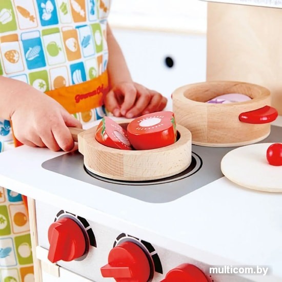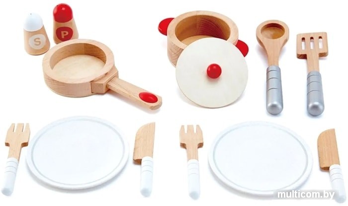| Посуда, продукты, аксессуары в комплекте | вилка (2 шт.), нож (2 шт.), кастрюля, сковорода, кухонные приборы (половник, лопатка с прорезями), тарелка (2 шт.), солонка (2 шт.) |