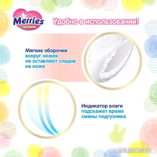 | Информация | Дышащие трусики Merries идеально подойдут малышу, который начинает активно двигаться. Даже если малыш очень активный, трусики-подгузники Merries надежно защищают от протеканий и опрелостей, обеспечивая необходимый комфорт и свободу движений!Крой трусиков Merries разработан с учетом анатомических особенностей малыша:? Хорошо сидят на талии и не сползают, но при этом не жмут и не оставляют следов на нежной коже малыша.? Отлично облегают попку, сохраняют форму и заботятся о комфорте малыша, даже когда трусики уже наполнены.? Комфортно садятся в паховой области и не создают дискомфорта между ножек.? Нежно облегают ножки, не образуют щелей и защищая от протекания. |