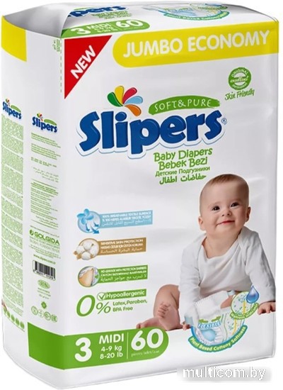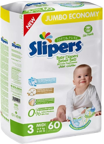 | Информация | ? Подгузники Slipers Midi J-203 отличаются от других благодаря эластичной боковой клейкой ленте, глубокой защите кремом и защитному барьеру против протекания. ? Материал из мягкого хлопка и экстра скоростное впитывание делают их особенно комфортными для малышей. ? Подгузники прилегают к телу и не сковывают движения ребенка, обеспечивая ему свободу и удобство. ?? Для производства подгузников используются только натуральные гипоаллергенные материалы, что делает их безопасными для кожи малышей. |