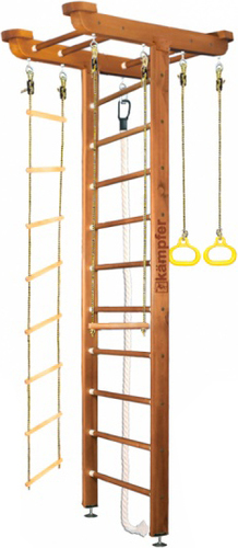 | Информация | Конструкция выполнена из натурального дерева, все края деталей немного скруглены обеспечивая большую безопасность для ребенка. Крепление враспор между потолком и полом удобно тем, что подходит для любых стен и комплекс можно передвигать с места на место. Но потолок не должен быть из хрупких материалов, таких как гипсокартон(навесные) и вагонка, для них лучше подойдут пристенные модели. Комплектация: — шведская стенка — канат — кольца — верёвочная лестница — трапеция |