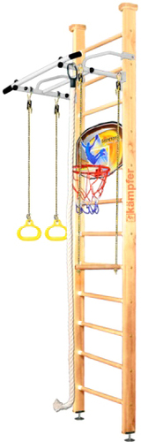 | Информация | Домашний спортивный комплекс Helena Wall Basketball Shield включает в себя набор из самых популярных навесных аксессуаров канат, гимнастические кольца, трапецию и баскетбольный щит с мячом. С баскетбольным щитом можно играть в одиночку или устраивать соревнования с друзьями и родителями, ведь даже взрослым будет интересна такая игра. Вы сможете постепенно усложняя игру перевешивать щит выше на одну ступеньку. Упражнения с мячом прекрасно тренируют мышцы рук, увеличивая ловкость и внимание, занимают и одновременно физически развивают ребенка, что очень полезно для здоровья. Крепкий металлический турник выдерживает нагрузку до 120 кг, подходит как детям так и взрослым. Навесное оборудование Kampfer на прочных тросах выдерживает нагрузку до 100 кг. |