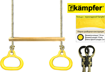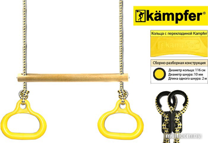 | Информация | Кольца гимнастические с перекладиной Kampfer расширяют возможности комплекса. На кольцах 2 в 1 Kampfer можно висеть, хватаясь руками или ногами. Кроме того, кольца можно использовать как дополнительную опору во время лазания по спортивному комплексу. Пластиковые гимнастические кольца — спортивный аксессуар для спорткомплексов любой модификации. Оригинальный дизайн колец отличает продукцию Kampfer от колец других производителей. Комплектация: - Кольцо: 2 шт. - Шнур: 2 шт. - Катушка: 2 шт. - Фиксатор: 2 шт. |
