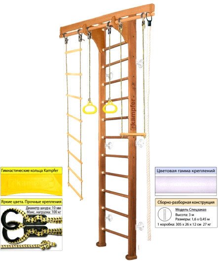 | Информация | Конструкция выполнена из натурального дерева, все края деталей немного скруглены обеспечивая большую безопасность для ребенка._x000D_ Домашний спортивный комплекс Kampfer Wooden Ladder Wall. Способ установки пристенный - крепится к стене. Универсальный и надежный вариант крепления. _x000D_ Можно использовать для помещений с подвесными и натяжными потолками. Не подходит при хрубких и гипсокартонных стенах , для них лучше подойдут модели с креплением враспор._x000D_ Особенностью моделей Kampfer является шесть креплений к стене, в отличие от обычных пристенных моделей, у которых только четыре крепления._x000D_ Увеличение количества креплений до шести обеспечивает самые надежные и максимально безопасные занятия на ДСК Kampfer._x000D_ |