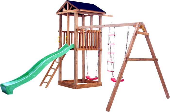 | Информация | Базовый блок достигает высоты 320 см. В нижней части предусмотрено место для песочницы. Подъем на верхний ярус осуществляется по лестнице, оснащенной удобными поручнями. Ограждение из березового штакетника на втором этаже надежно защищает детей во время перемещений от выпадения, а крыша становится барьером на пути осадков, солнечных лучей.Спортивный городок дополнен:- пластиковой горкой Complex длиной 3 м. Она имеет ряд достоинств: эксплуатируется круглогодично, оснащена бортиком, долговечна, надежна; - веревочной лестницей Complex; - качелями Лодочка в количестве 2 штук. |