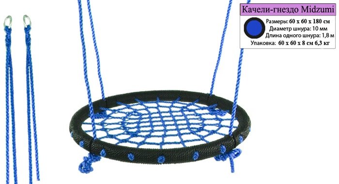 | Информация | Характеристики:###BR###— Габаритные размеры (ДхШхВ): 60 x 60 x 180 см###BR###— Материал: полимерный материал, металл.###BR###— Рекомендуемый возраст: от 3 лет.###BR###— Максимальная нагрузка: 100 кг.###BR###— Толщина каната: 10 мм.###BR###— Длина каната: 1,8 м###BR###— Диаметр качелей снаружи: 62 см###BR###— Диаметр сиденья внутри: 54 см###BR###— Габаритные размеры упаковки (ДхШхВ): 60 x 60 x 8 см###BR###— Вес нетто: 6 кг |