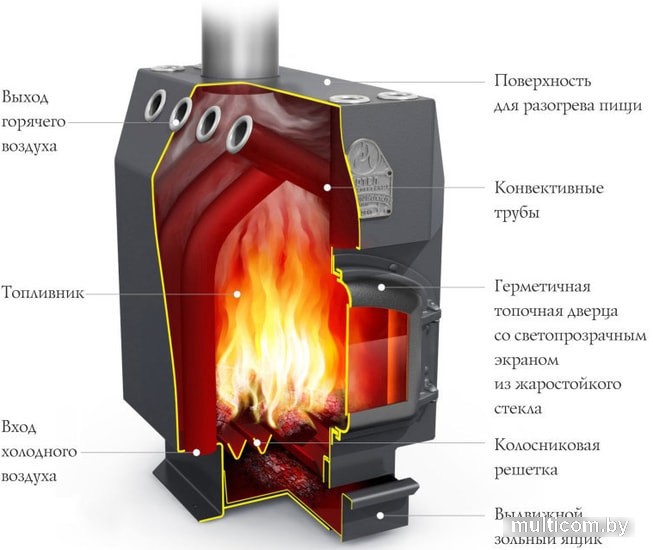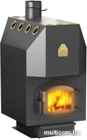 | Информация | Модификация печи «Доцент», отличающаяся наличием стальной дверцы и выходом дымовой трубы вверх.Линейка твердотопливных воздухогрейных котлов длительного горения «Профессор» номинальной мощностью от 6 до 40 кВт предназначена для экономичного воздушного отопления жилых и нежилых помещений максимальным объемом от 100 до 1000 м3 соответственно. В линейку входят модели «Гимназист», «Студент», «Инженер», «Доцент» и «Профессор», объединенные общим принципом действия, компоновкой и применяемым топливом. Отличаются они габаритными размерами, массой, объемом камеры сгорания, диаметром и количеством конвективных труб, площадью поверхностей нагрева, а также диаметром выхода дымохода.Конвективные теплообменные трубы по всему поперечному сечению и по всей длине, от начала до конца, находятся непосредственно в пламени. Передняя и задняя поверхности, на которых размещены конвективные трубы, полноценно участвуют в конвективном теплообмене. Входные отверстия конвективных теплообменных труб находятся на возвышении от уровня пола, что благоприятно для свободной конвекции нагреваемого воздуха.Большой герметичный топливник позволяет эффективно использовать печь в режиме длительного горения. Топка имеет форму пламени свободно сжигаемого твердого топлива.Специальные жиклеры подают горячий воздух для дожигания уходящих газов.Большой сменный колосник обеспечивает равномерное горение по всей площади топки. Зола через щели колосника ссыпается в зольный ящик. Емкий выдвижной зольный ящик позволяет, удалять золу, не прерывая процесса горения. |