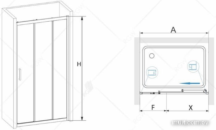 | Информация | Душевая дверь раздвижная с двумя подвижными створками и одной фиксированной. Двери двигаютcя одновременно. |