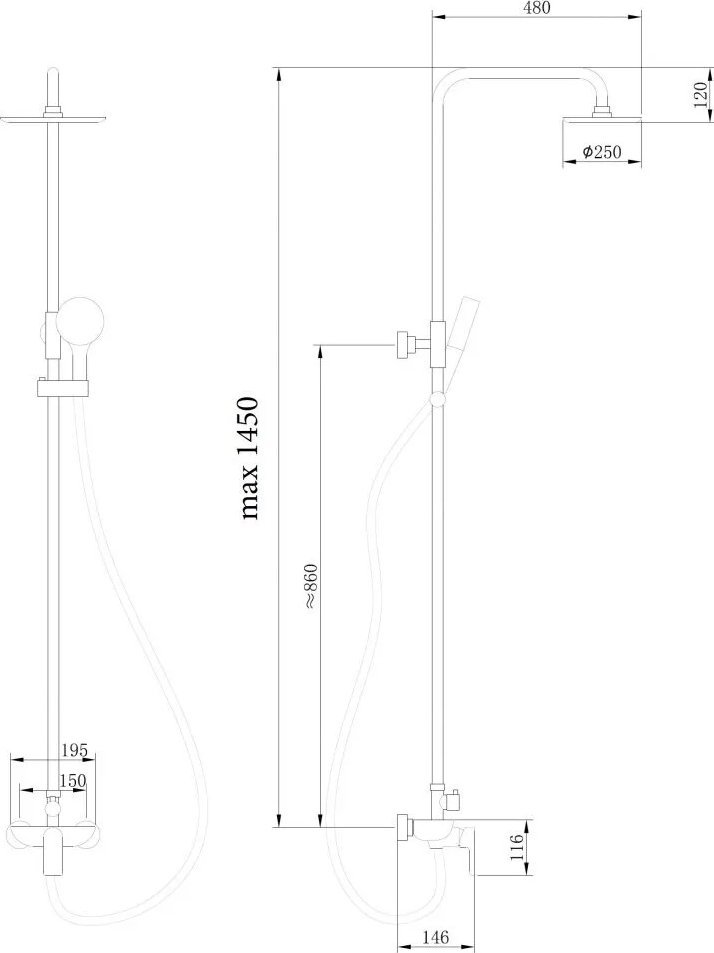 | Комплектация | верхний душ, штанга, ручной душ (лейка), держатель лейки, шланг, смеситель |