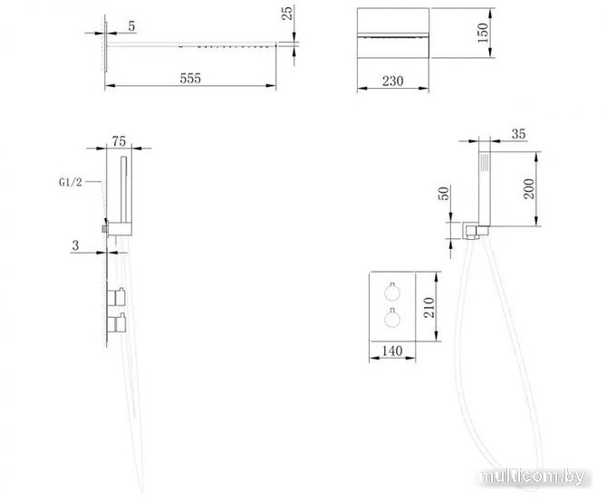 | Комплектация | верхний душ, ручной душ (лейка), держатель лейки, шланг, смеситель |