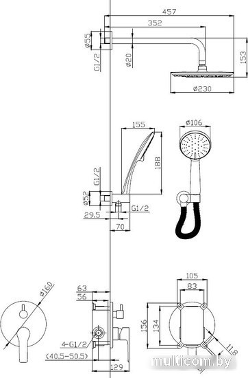 | Комплектация | верхний душ, ручной душ (лейка), держатель лейки, шланг, смеситель |