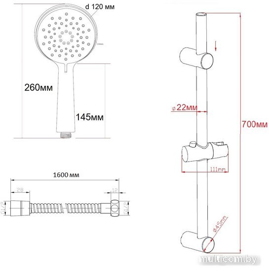 | Комплектация | штанга, ручной душ (лейка), держатель лейки, шланг, мыльница или держатель для мыла |