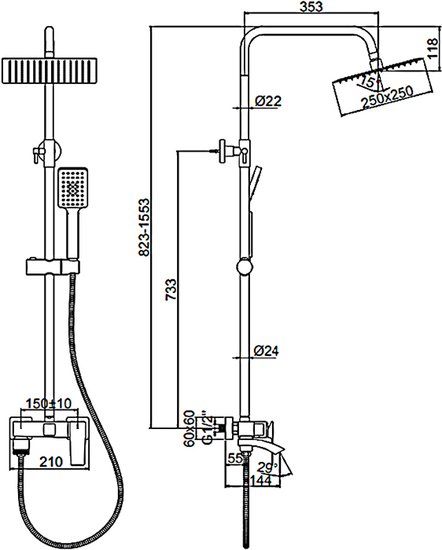 | Комплектация | верхний душ, штанга, ручной душ (лейка), держатель лейки, шланг, смеситель, излив для ванны, каскадный излив |