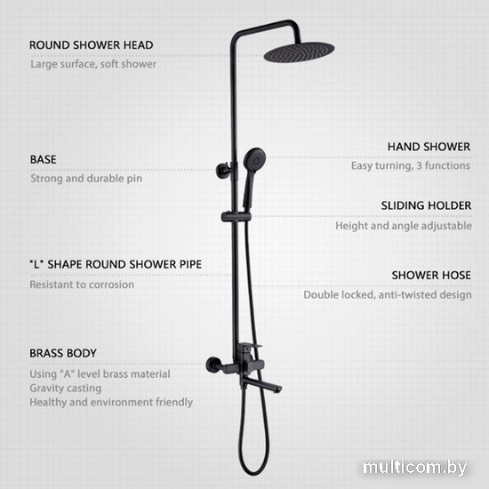 | Комплектация | верхний душ, штанга, ручной душ (лейка), держатель лейки, шланг, смеситель, излив для ванны |