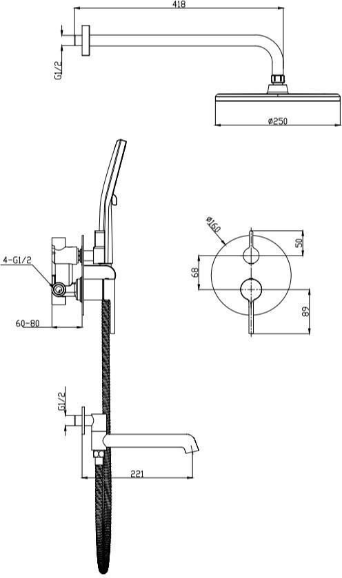 | Комплектация | верхний душ, ручной душ (лейка), держатель лейки, шланг, смеситель, излив для ванны |