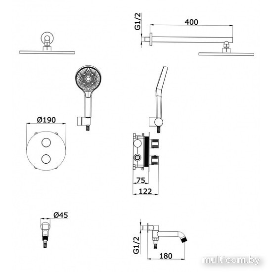 | Комплектация | верхний душ, ручной душ (лейка), держатель лейки, шланг, смеситель, излив для ванны |