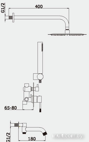 | Комплектация | верхний душ, ручной душ (лейка), держатель лейки, шланг, смеситель, излив для ванны |