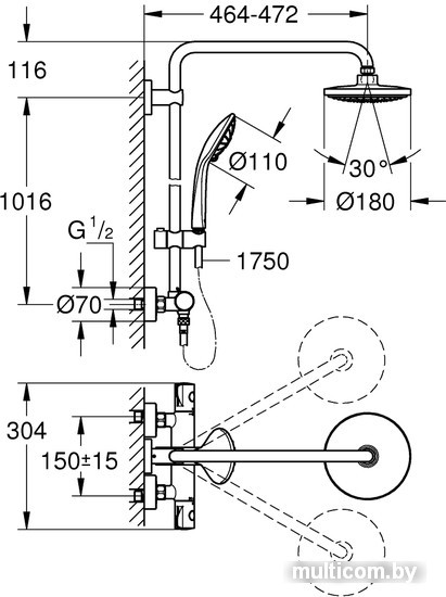 | Диаметр (ширина) верхнего душа | 180 мм |