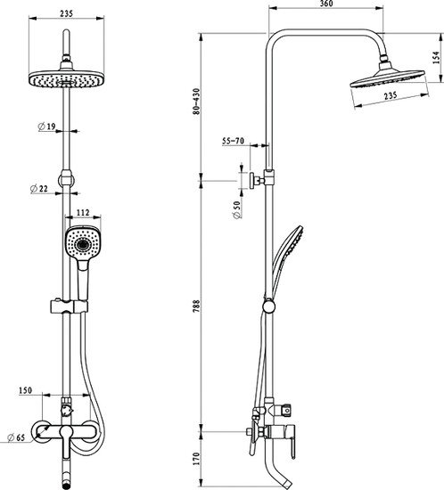 | Диаметр (ширина) верхнего душа | 235 мм |