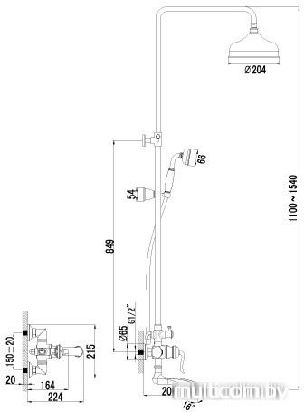 | Диаметр (ширина) верхнего душа | 204 мм |