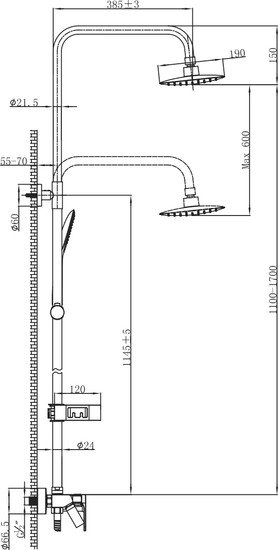 | Вылет верхнего душа | 385 мм |