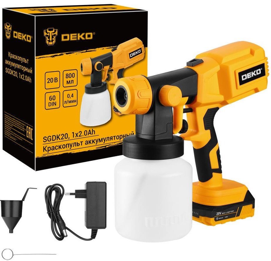 | Информация | Краскопульт аккумуляторный DEKO SGDK20, 1x2.0Ah используется для обработки поверхности водно-меловыми и водно-известковыми составами при строительно-отделочных работах, при опрыскивании и побелке садов, дезинфекции помещений. |