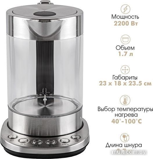 | Информация | Электрический чайник Endever KR-366G – это модель, которая поможет Вам наслаждаться чашечкой горячего чая или кофе в любое время дня! Вместительный и мощный - объем 1,7 литров и мощность 2200 Вт позволяют быстро вскипятить воду. Корпус выполнен из высокопрочного стекла, благодаря которому эта модель будет радовать Вас долгое время. К тому же, выбрав желаемую температуру - 40, 70, 90 или 100 градусов, вы сможете приготовить любимый напиток правильно и вкусно. Благодаря функции поддержания температуры, чайник KR-366G сохранит идеальную температуру воды в течение часа. Кнопочная панель управления со светодиодной подсветкой позволяет легко настроить температуру воды и поддержание температуры. И, конечно же, ваша безопасность всегда будет на первом месте - автоотключение при закипании и отсутствии воды гарантирует использование чайника KR-366G долгое время. А для тех, кто любит порядок и уют, чайник оснащен отсеком для хранения шнура, что облегчает его хранение без лишних помех. Облегчите свою жизнь с нашим элегантным и удобным чайником Endever KR-366G и балуйте себя идеальными напитками! |