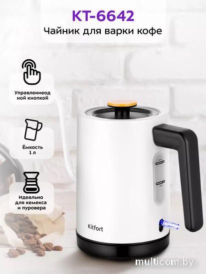 | Информация | Электрический чайник КТ-6642 предназначен для кипячения воды и приготовления кофе. Длинный изогнутый носик чайника формирует тонкий и ровный поток воды, что является обязательным условием для приготовления кофе в кемексе или пуровере. Длинный носик формирует тонкий и ровный поток воды, что является важным условием для приготовления кофе проливным способом. Благодаря тонкому носику вы можете постепенно добавлять воду в кофе, добиваясь равномерной экстракции и раскрывая вкус кофе. Корпус чайника выполнен из нержавеющей стали, крышка из нержавеющей стали и пластика. Ручка - пластиковая, не нагревается и удобно лежит в руке. Управление осуществляется с помощью переключателя, который расположен под ручкой. Чайник выключается автоматически, когда вода закипела. При необходимости вы можете выключить чайник раньше, нажав на переключатель. Прежде чем снять чайник с подставки, дождитесь его автоматического выключения либо выключите чайник. Подставка с центральным контактом даёт возможность располагать на ней чайник в любом положении, обеспечивая вращение на 360°. Снизу имеется отсек для хранения шнура, в который можно смотать излишки шнура электропитания. Чайник КТ-6642 выполнен в дизайне коллекции «Penguin Pack», который отражает энергию и яркость нового маскота - пингвина по имени Питер. В комплекте с прибором вы найдёте креативный магнит с этим персонажем. |