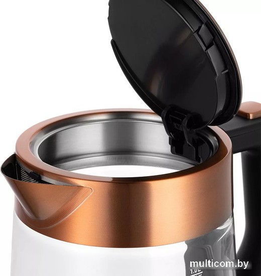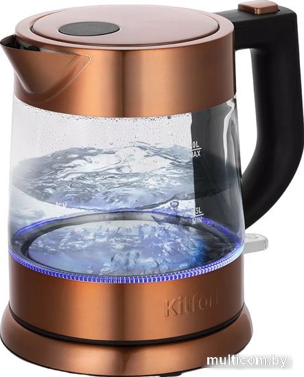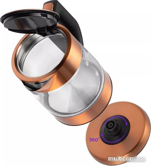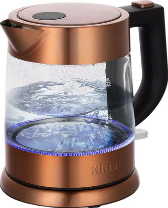 | Информация | Электрический чайник Kitfort KT-6659 предназначен для быстрого кипячения воды дома, в офисе или на даче. Этот стильный чайник медного цвета представляет собой идеальное сочетание стекла, пластика и нержавеющей стали. Его мощность 2200 Вт. На внешней стороне чайника расположена мерная шкала, рассчитанная на объём до 1 л. Нагревательный элемент этого чайника спрятан под металлической пластиной из нержавеющей стали. Это облегчает его очистку и значительно снижает шум при кипячении воды. Чайник автоматически отключается при закипании, имеет защиту от перегрева и от включения без воды. Образующийся пар внутри попадает в паропровод с термодатчиком. Такая конструкция позволяет отключаться при закипании воды независимо от альтитуды. В носике чайника Kitfort KT-6659 имеется фильтр, который улавливает частицы накипи и предотвращает их попадание в чашку. На ручке чайника имеется кнопка для автоматического открытия крышки. Мощности чайника достаточно для того, чтобы быстро вскипятить полный объём чайника. При включении синяя подсветка по периметру дна сигнализирует о его рабочем состоянии, а также красиво подсвечивает воду. Снизу имеется отсек для хранения шнура, в который можно смотать излишки шнура электропитания, чтобы он не мешал на столе. Длина шнура 0,7 м. Подставка с центральным контактом позволяет разместить чайник в любом положении на 360°. |