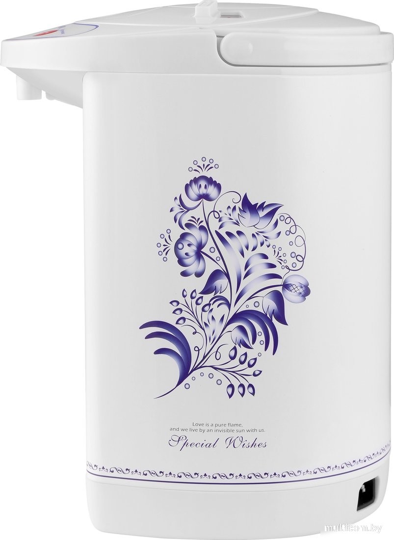 | Информация | -Термопот OPTIMA AP-453CGZ представляет собой функциональное устройство с объемом резервуара 4.5 литра, отличающееся оригинальным дизайном с гжельской росписью. Такой внешний вид делает термопот не только практичным прибором, но и ярким элементом интерьера кухни или тематического кафе. -Внутренний бак выполнен из нержавеющей стали, что обеспечивает долговечность, устойчивость к повреждениям и коррозии. Модель оснащена функциями первичного и повторного кипячения, а также поддержанием температуры, что позволяет всегда иметь под рукой горячую воду. -Для удобства пользователей предусмотрено три способа подачи воды:с помощью электронасоса, ручной помпы и кнопки под носиком. Поворотная подставка облегчает использование прибора на столе без необходимости его поднимать, а мерная шкала позволяет контролировать уровень воды. -Безопасность обеспечивается блокировкой включения при пустой емкости, защищая термопот от перегрева и поломок. Управление осуществляется с помощью кнопок, а индикация режимов работы делает эксплуатацию максимально простой и понятной. |