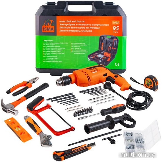 | Комплектация | В наборе: электродрель(модель: Z1J-DH11-13B), ручка для дрели, ограничитель глубины, сверла по металлу 6 шт.(3, 4, 5, 6, 8, 10 мм), сверла по бетону 3 шт.(6, 8, 10 мм), сверла по кафелю 2 шт.(6, 8 мм), сверла по дереву 6 шт.(3, 4, 5, 6, 8, 10 мм), биты 10 шт., комбинированные плоскогубцы 150 мм, уровень, ножовка по металлу 150 мм, канцелярский нож, разводной ключ 200 мм, молоток, рулетка 3 м, комплект метизов 60 шт., рукоятка с магнитным битодержателем, в кейсе. |