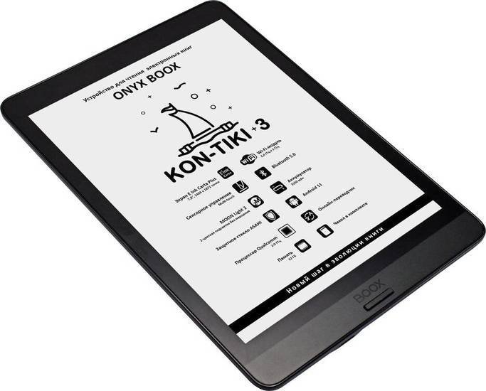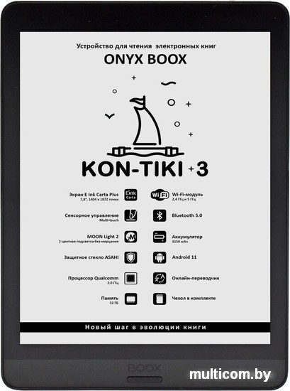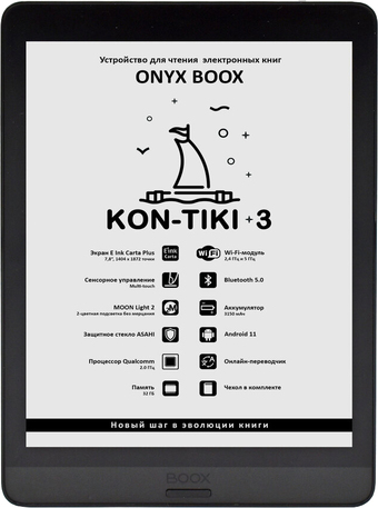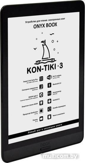 | Информация | ONYX BOOX KON-TIKI 3 — устройство для чтения электронных книг с 7,8-дюймовым экраном E Ink Carta Plus с подсветкой и сенсорным управлением. Современный 4-ядерный процессор в сочетании с 3 ГБ оперативной памяти обеспечивают комфортную скорость работы при любых сценариях использования устройства. Встроенный модуль Wi-Fi обеспечивает возможность скачивать книги из сети Интернет и пользоваться различными сетевыми сервисами, а поддержка Bluetooth — подключать внешние устройства. Благодаря увеличенному экрану данная модель позволит с комфортом совмещать чтение художественной и технической литературы. Android 11 дает возможность устанавливать и использовать сторонние приложения и делает устройство более универсальным. Ридер имеет компактный легкий корпус, экран дополнительно закрыт защитным стеклом. В комплекте с ONYX BOOX KON-TIKI 3 поставляется защитная обложка. |