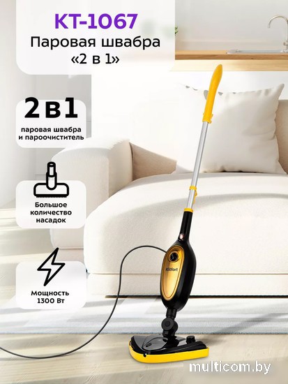 | Информация | Паровая швабра КТ-1067 — универсальное устройство, которое поможет избавиться от пыли и грязи с помощью мощной струи пара, а также продезинфицирует обрабатываемую поверхность. Уборку паровой шваброй можно проводить без чистящих средств. Конструкция «2 в 1» предусматривает наличие ручного модуля паровой швабры, который удобно использовать с насадками. С помощью насадок можно очистить большинство вещей в доме. При помощи специальных насадок из комплекта КТ-1067 вы можете очистить напольные покрытия, раковину и плиту на кухне, зеркала, окна и плитку в ванной без каких-либо химических средств, исключительно паром. Плоская нейлоновая щётка удобна для уборки радиаторных батарей и решётчатых поверхностей, а струйная для чистки щелей и углов. Скребок подойдёт для очистки окон, зеркал и кафельной плитки. Латунная щётка поможет справиться со стойкими загрязнениями. Принцип действия паровой швабры основан на воздействии горячего пара на загрязнения. Пар проникает внутрь загрязнения, размягчая и растворяя его, а затем с помощью тряпки частички грязи смываются. Высокая температура пара способствует процессу очистки. Устройство обладает большим углом наклона при уборке, который поможет легко убирать пространство под мебелью. Напольная насадка закреплена на специальном шаровом шарнире с наклоном в двух плоскостях, что делает швабру очень манёвренной и облегчает уборку. Устройство оснащено резервуаром для воды ёмкостью 300 мл, что позволяет производить непрерывную уборку 8-10 минут. Для удобного наливания воды в комплекте предусмотрен мерный стакан. В комплекте предусмотрено множество насадок для различного использования. Также к паровой швабре будут идти мерный стакан, воронка, тряпки для пола и рамка для ковра. У паровой швабры предусмотрены держатели для шнура с обратной стороны прибора. Это способствует комфортному и компактному хранению устройства в домашних условиях. |