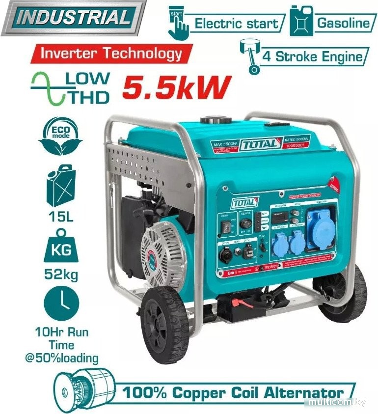 | Информация | TOTAL TP355001 – бензиновый инверторный генератор для интенсивного использования (industrial) Высокая нагрузочная способность для генераторов такого типа среди конкурентов (5,5 kW номин. мощность) 2 типа стартера – ручной и электрический Надежный бензиновый 4-х тактный двигатель увеличенного объема для высокой надежности (275 см.куб) Большой объем бака для топлива(15л с индикатором уровня) для высокого показателя автономности работы -до 10 часов непрерывной работы (при 50% загрузке)) 2 режима работы Standard/ Eco – для экономии топлива Полностью медная обмотка альтернатора (генератора) – высокая надежность, в сравнении с алюминиевой Микропроцессорное управление модулем инвертора – чистая синусоида на выходе, не зависимо от нагрузки, возможность подключать сложную электронику для ее стабильной работы, в сравнении с традиционными электростанциями с системой AVR Цифровой дисплей отображает основные параметры Индикаторы перегрузки, eco-режима, критического уровня масла USB-зарядное устройство Выходные цепи защищены автоматическими выключателями Компактные размеры генератора Усиленная рама На 25% меньший вес, по сравнению с традиционными генераторами Транспортный комплект уже установлен на раме |