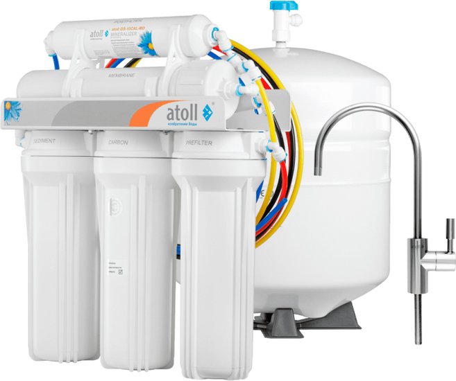 | Информация | Аtoll А-550m STDA — пятиступенчатая cистема очистки водопроводной воды с использованием технологии обратного осмоса. Полупроницаемая структура обратноосмотической мембраны исключает из воды все посторонние примеси: растворенные соли, бактерии, вирусы. Предварительную очистку осуществляют префильтры. Производительность atoll А-550m STDA — 120 литров в сутки. |