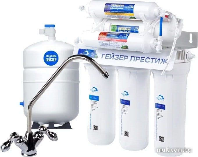 | Описание фильтра | ПФМ 5/1 10SLВ первую колбу установлен сменный элемент из вспененного полипропилена. Его особенностью является переменная пористость, изменяющаяся с 5 до 1 мкм по мере прохождения воды сквозь картридж. Такого размера пор достаточно для удаления всего спектра нерастворимых в воде соединений: ржавчины, известковых отложений, песка и т.д.СВС10 10SLВо второй и третьей колбах находится картридж из кокосового активированного угля. Этот сменный элемент отвечает за удаление из воды растворенных в воде вредных органических веществ, избавление от хлора и его соединений.VONTRON 50Четвертая ступень очистки – обратноосмотическая мембрана.БАК 12ЛОчищенная мембраной вода поступает в накопительный бак. В нем имеется резиновая диафрагма, за счет которой, по мере наполнения, обеспечивается необходимое давление, достаточно для подачи воды в кран.ПОСТФИЛЬТРПятая ступень очистки – угольный постфильтр. Он служит для того, чтобы подготовить воду, долгое время находящуюся в накопительном баке.МИНЕРАЛИЗАТОРШестая ступень – минерализатор. Он представляет собой картридж, проходя через который, жидкость насыщается полезными солями.ЛЮКС (ДВОЙНОЙ)В комплект фильтра обратного осмоса Гейзер Престиж М входит кран с двумя поворотными ручками. У вас будет выбор между очищенной водой и очищенной водой прошедшей минерализатор.Для осуществления монтажных работ и нормального функционирования системы обратного осмоса в комплектацию фильтра также входит вентиль накопительного бака, ограничитель дренажного потока, обратный клапан, автопереключатель воды, комплект дренажного хомута, адаптера с краном подачи воды и трубок JG 1/4". |