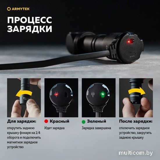 | Информация | Wizard C2 Pro — первый мультифонарь в обновленной линейке Armytek. Заряжается от любого USB-источника питания с помощью магнитного USB-кабеля. Мощный магнит в задней крышке позволяет закрепить фонарь на любой металлической поверхности. В комплект входит комфортное налобное крепление, клипса для фиксации на одежде или рюкзаке и велокрепление ABM-01. Wizard C2 Pro совместим с креплением на каску AHM-02 и подходит для строительных работ. |