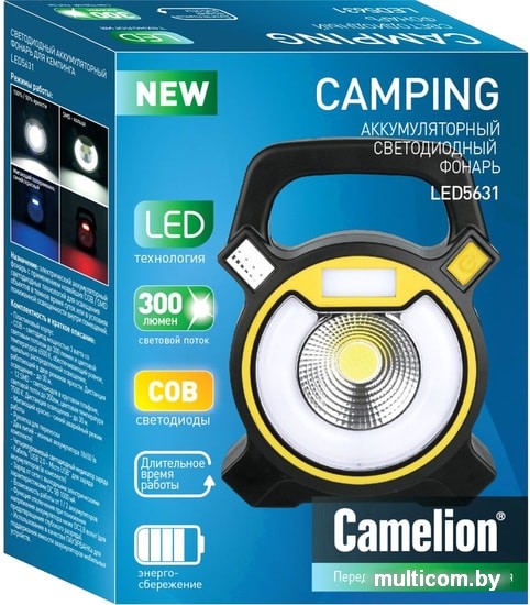 | Информация | Фонарь Camelion электрический аккумуляторный светодиодный кемпинговый. Материал корпуса: ABS - пластик. Источники света: COB - светодиод мощностью 3 Ватта с цветовой температурой 6500К и максимальным суммарным световым потоком 300 люмен - в отражателе и 12SMD - светодиодов с суммарной мощностью 3 ватта с цветовой температурой 7500К с максимальным световым потоком 250 люмен в кольцевом плафоне. Дистанция освещения: COB режим 100% яркости - до 30 метров, COB режим 50% яркости - до 15 метров, 12SMD режим - до 30 метров, мигалка красный / синий - 100 метров. Четуре режима работы. Выключатель - кнопочного типа. Время работы при полностью заряженных аккумуляторах (емкостью 1200 мА-ч каждый): COB режим 100% яркости - до 2 часов, COB режим 50% яркости - до 4 часов, 12SMD режим - до 2 часов, мигалка красный / синий - 120 часов. Время заряда - 4 часа. Заряд от любой сети с выходными характеристиками DC 5Вольт 1 Ампер, возможность заряда от фонаря мобильных устройств (ПАУЭРББАНК) через кабель, входящий в комплект. Возможность работы как от двух, так и от одного аккумулятора (время работы от одного аккумулятора уменьшается). Функция защиты аккумуляторов от глубокого разряда (напряжение менее 2,8 вольт). |