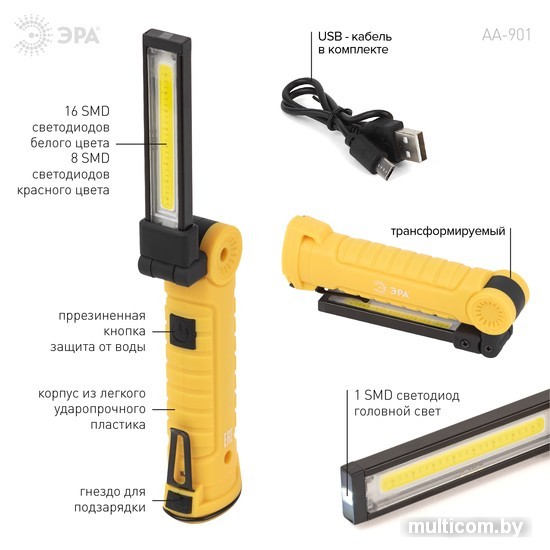 | Информация | ЭРА AA-901 – многофункциональный светодиодный фонарь-трансформер с поворотной на 360° LED-платой. Оснащён 3 типами креплений: магнит, клипса, крючок. Имеет встроенный аккумулятор, подзаряжается при помощи USB-кабеля (в комплекте). Одного полного заряда хватает на 5 часов непрерывной работы. Степень защиты фонаря от влаги и пыли – IP44. Фонарь комфортен в применении: корпус из легкого ударопрочного пластика, прорезиненная кнопка включения, гнездо для зарядки защищено резиновой заглушкой. LED-плата объединяет светодиоды белого и красного цвета (16 SMD + 8 SMD). Она создает широкое заливающее освещение. Световой поток – 380 Лм. В головной части фонаря установлен светодиод 3 Вт с дальним направленным лучом. Дальность света – 15 м. В зависимости от задач можно выбирать любой из 5 режимов освещения: разные варианты яркости (100 и 50%), статичный красный или динамичный красный свет, головной свет. |
