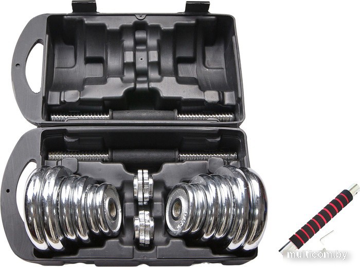 | Комплектация | - 2 грифа диаметром 26 мм, длиной 35 см (длина резьбы 11 см с каждой стороны) и весом 1,35 кг - 4 зажима, которые обеспечивают точные нагрузки давления - 4 диска х 0,5 кг (диаметр 9,5 см, ширина 1,4 см) - 4 диска х 1,25 кг (диаметр 11 см, ширина 1,8 см) - 4 диска х 2,5 кг (диаметр 15 см, ширина 2,2 см) - 1 соединительный гриф |