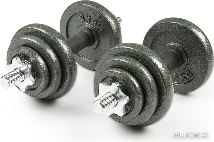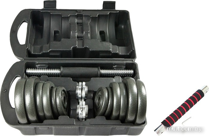| Комплектация | - 2 грифа диаметром 26 мм, длиной 35 см (длина резьбы 11 см с каждой стороны) и весом 1,35 кг - 4 зажима, которые обеспечивают точные нагрузки давления - 4 диска х 0,5 кг (диаметр 9,0см, ширина 1,4 см) - 4 диска х 1,25 кг (диаметр 12 см, ширина 1,8 см) - 4 диска х 2,5 кг (диаметр 14,5 см, ширина 2,2 см) - 1 соединительный гриф |