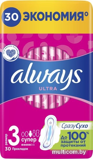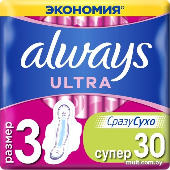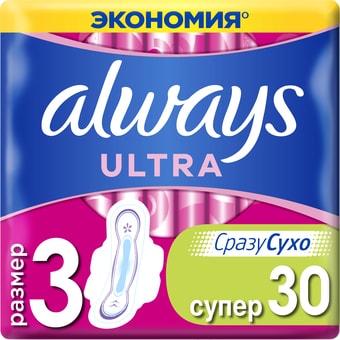 | Информация | Гигиенические прокладки Always Ultra Супер (Размер 3) с системой СразуСухо мгновенно впитывают влагу. и удерживают ее внутри, обеспечивая до 100 % защиты и уверенности. Гигиенические прокладки Always Ultra оснащены технологией нейтрализации запаха, которая блокирует неприятный запах, а не просто маскирует его. Гигиенические прокладки Always Ultra толщиной всего 3 мм дарят комфорт и обеспечивают непревзойденную защиту во время менструации.Обеспечьте себе наилучшую защиту с помощью Always Мой размер — специальной системы определения размера, которая помогает правильно подобрать прокладку Always на основании количества выделений и размера трусиков. Оставайтесь под надежной защитой, как бы активно вы ни двигались.Попробуйте Always Ultra Ночные экстра защита (Размер 5) — лучшие гигиенические прокладки Always для защиты в ночное время. Суперабсорбирующий внутренний слой с системой СразуСухо мгновенно впитывает жидкость и удерживает ее внутри. Технология нейтрализации запаха блокирует неприятный запах, обеспечивая ощущение свежести и чистоты во время менструации. Контуры SecureGuard для дополнительной защиты со специальным гелем, удерживающим жидкость внутри. Гигиенические прокладки Always Ultra не раздражают кожу (доказано дерматологами). Крылышки помогают удерживать прокладку на месте для надежной защиты и ощущения комфорта. Невероятно мягкие и тонкие. |