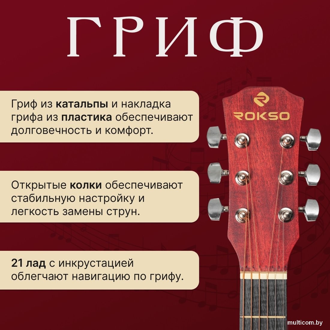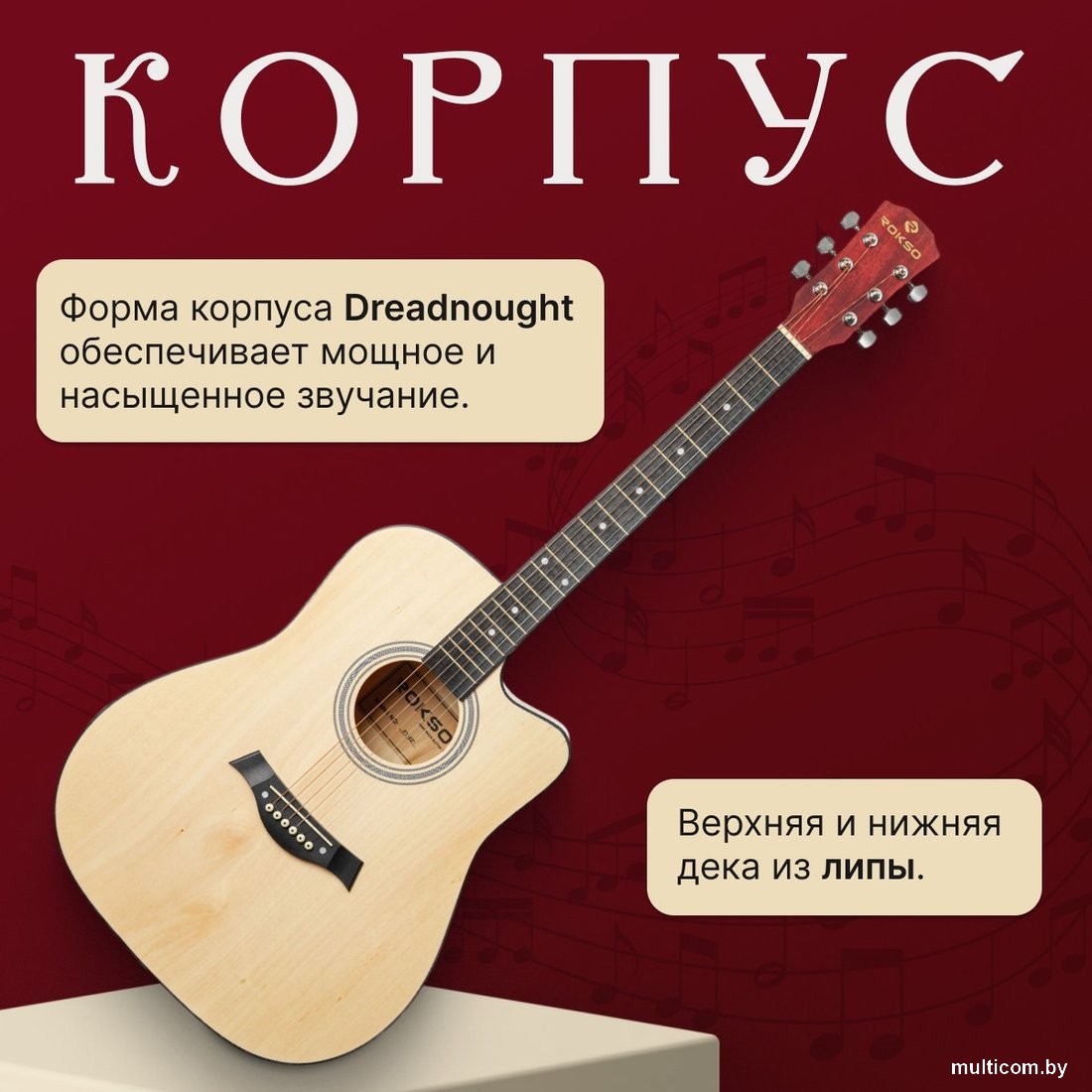 | Информация | - Акустическая гитара ROKSO FT-221 - это современный инструмент, сочетающий в себе стильный внешний вид и хорошие звуковые характеристики. Гитара выполнена в классической форме dreadnought с катавеем, что обеспечивает удобство при игре на высоких ладах и делает инструмент универсальным для различных музыкальных жанров. - Корпус гитары изготовлен из липы, что придает инструменту прочность, долговечность и устойчивость к внешним воздействиям. - Гриф выполнен из катальпы, а накладка на гриф - из пластика, что способствует комфортному ощущению в процессе игры. На грифе установлено 21 лад с инкрустацией, что облегчает навигацию для начинающих и опытных гитаристов. - Длина мензуры составляет 24.8 дюйма, что делает инструмент удобным для большинства пользователей. Открытые металлические колки обеспечивают точную настройку и стабильность звучания, а наличие выреза (катавея) облегчает исполнение сложных партий на верхних ладах. |
