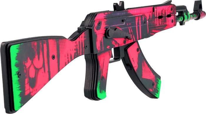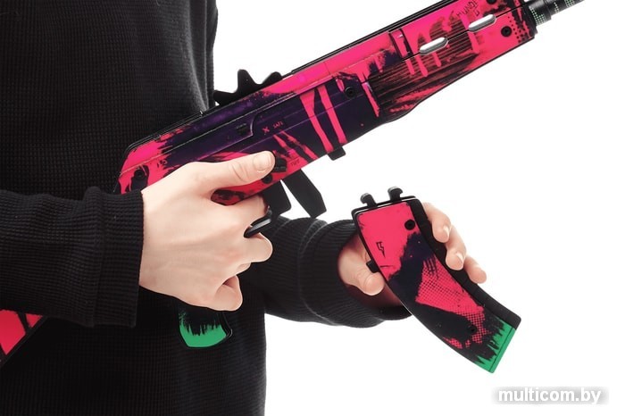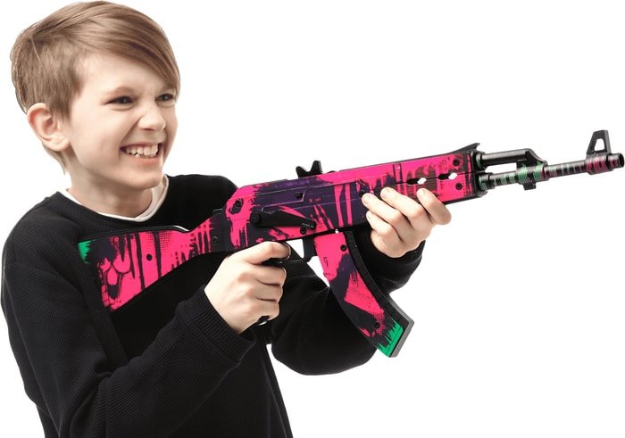 | Информация | Представляем вам всемирно известное изобретение боевого арсенала – непревзойденный автомат Калашникова. Гордость распирает, когда понимаешь, что произведением нашего соотечественника пользуется весь мир! И неспроста. Ведь АК-47 – самая мощная винтовка, известная своей боевой эффективностью.Наш деревянный аналог такой же, как и оригинал, но лучше. Ведь несет в себе мир и увлекательное приключение. Безопасный для людей автомат может стрелять (резинками), у него двигаются все механизмы, надежно скрепленные болтами, у него вытаскивается магазин. А также есть крепление для штык-ножа. Но имейте в виду, что сам нож не идет в комплекте с автоматом. Его можно купить отдельно.По характеристикам: стреляет очередями до 15 м. Единовременно можно заряжать от 2 до 20 резинок. Реалистичное закругленное дуло. Имеется предохранитель.Попробуйте угадать по описанию: какой один из самых популярных скинов для АК-47 с большим числом поклонников? Сложно? А так? Черный корпус неравномерно окрашен неоновыми красками розового и зеленого цвета. Бомбическая зеленая надпись Anarchy под граффити. На коробке и прикладе череп, сделанный пятнами краски?Конечно же, это Неоновая революция! Только такое название может охарактеризовать столь бунтарский окрас. Калаш Neon Revolution не просто популярен, он еще и мега красив. Яркая дерзкая расцветка – это именно то, что так нужно в сером будничном мире. Поверьте, в вашем дворе вы станете биг боссом с такой крутой игрушкой!Размеры автомата Калашникова: длина 68 см, высота 23 см, ширина 3,5 см. В комплекте идет 60 резинок. АК-47 разрабатывается по официальной лицензии от концерна «Калашников» |