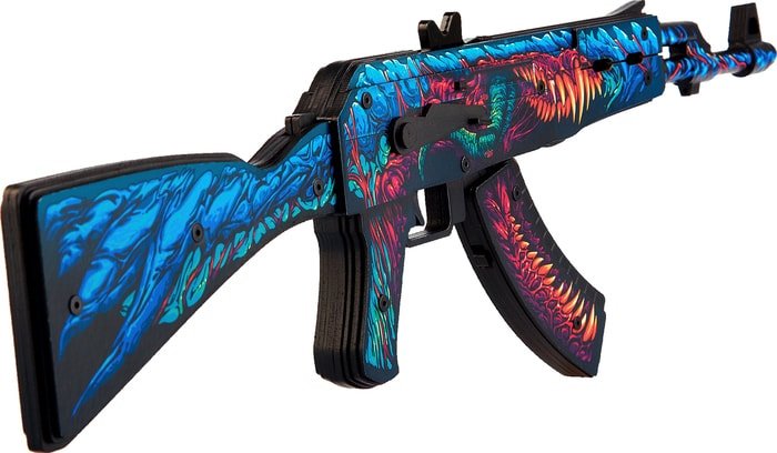 | Информация | Автомат Калашникова – это произведение искусства. Не зря его создавали специально для конкурса оружия в 1947 году. И если вы не знали, откуда эта цифра 47, то именно из далеких советских времен. Сейчас АК используется по всему миру как грозное дальнострельное оружие. Не прошли мимо АК-47 и разработчики игры Counter Strike. И сейчас виртуальное пространство просто захвачено миллионами поклонников. Мы предлагаем вам совершенно реальный аналог АК-47 в скине из CS:GO Скоростной зверь (Hyper beast) по доступной цене. Вы сможете в своих собственных руках оценить по достоинству этот мощный аппарат. Данный скин для АК-47 настолько пользуется спросом, что мы не смогли обойти его мимо. А наши технологии нанесения краски позволяют выполнить любую сложную задачу. Калашников в сочной и смачной расцветке — это настоящий зверь, который оправдывает себя на все 100%. Чудовищная пасть с острыми зубами станет настоящей фурией для врагов и нечисти. Дерзкие нетривиальные для оружия оттенки оранжевого, малинового, голубого, розового и зеленого вдохновляют и радуют глаз.Красив снаружи, но также красив и изнутри. У нашего деревянного резинкострела, как и у настоящего оружия есть съемные магазин и приклад, также имеется предохранитель. Кроме этого винтовку через специальное крепление можно дополнить штык-ножом M9. Но в комплект байонет не входит. Его можно купить отдельно.АК-47 стреляет очередями резинками на расстояние до 15 м. Рекомендуемая норма для единовременного заряда – от 2 до 20 штук. Вся конструкция очень надежна, так как механизмы держатся на прочных болтах. Больше сходства с настоящим АК добавляет закругленное дуло.Размеры автомата Калашникова: длина 68 см, высота 23 см, ширина 3,5 см. В комплекте идет 60 резинок. АК-47 разрабатывается по официальной лицензии от концерна «Калашников» |