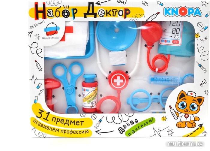 | Состав набора | ножницы (1 шт), шприц (1 шт), пинцет (1 шт), стетоскоп (1 шт), тонометр (1 шт), отоскоп (1 шт), молоточек (1 шт), капельница (1 шт), зеркало (1 шт), таблица проверки зрения (1 шт), зажим (1 шт), градусник (1 шт), рефлектор (налобный 1 шт), очки (1 шт), таблетки (1 упаковка 1, капсулы 1 упаковка ), пробирка (1 шт), колба (1 шт), банка (1 шт), бейдж (1 шт), шапка доктора (1 шт), лоток (1 шт), лист назначений врача (3 шт), халат доктора (1 шт), бинт (1 шт), грелка (1 шт), игрушечный инструмент (штатив 1 шт), печать |
